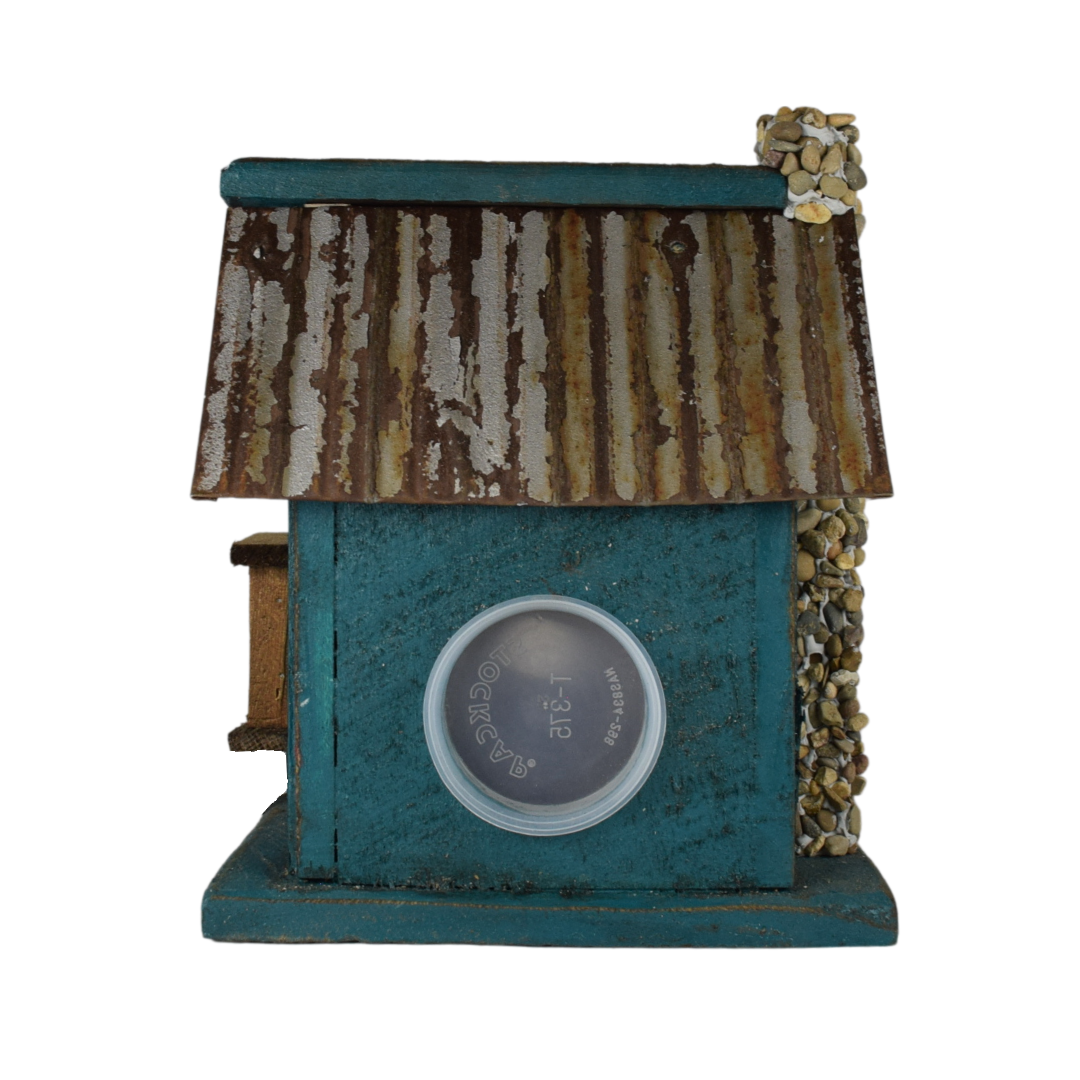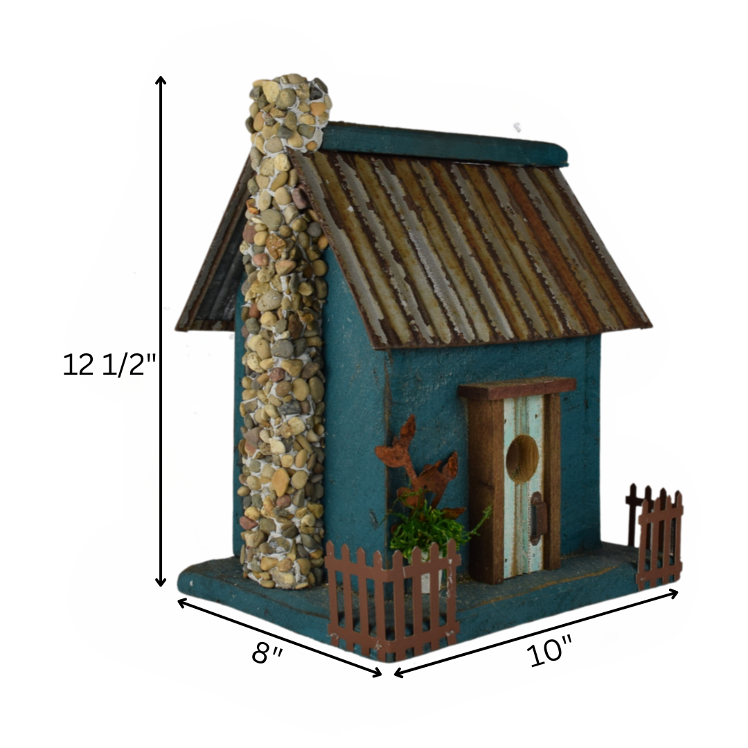 Handcrafted in America, this birdhouse combines rustic charm with functionality. The chimney is carefully hand-rocked, and the roof is made from recycled barn tin, giving it an authentic, weathered look. Crafted with attention to detail, it’s fully functional, featuring a clean-out hole and proper ventilation to ensure a cozy home for your feathered visitors.